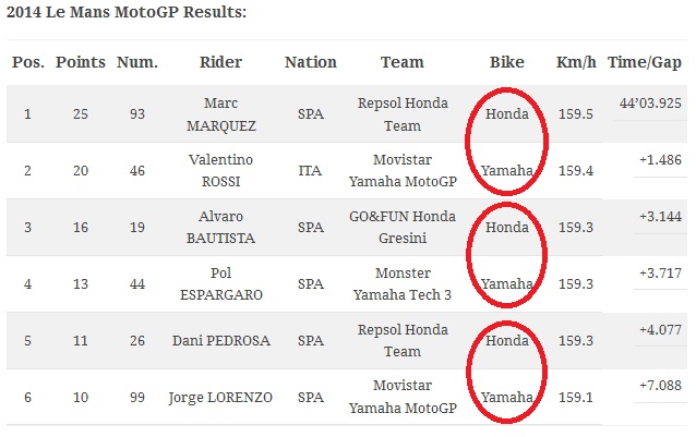 Perhatikan hasil di atas, dalam lingkaran2 merah adalah pembalap yang se-level, dan bukan kebetulan kalau pembalap honda di atas yamaha. Mungkin saja ada yang menganggap hasil ini adalah biasa, akan tetapi jika kita kelihat proses/balapannya sehingga urutan ini terjadi maka baru akan terasa bahwa yamaha memiliki tugas berat sebelum balapan di Mugello nanti.